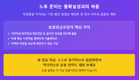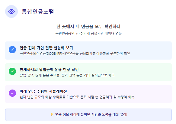 이처럼 통합연금포털 하나만 제대로 활용해도, 연금 정보를 찾고 정리하는 데 들이던 시간과 노력을 크게 줄일 수 있습니다.