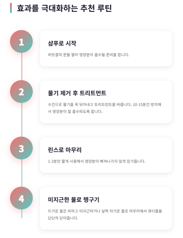 트리트먼트와 린스를 함께 사용하거나, 순서를 헷갈리는 분들도 많은데요. 가장 좋은 결과를 원한다면 ‘샴푸 – 트리트먼트 – 린스’ 순서를 꼭 지켜야 합니다. 샴푸로 머릿결에 문을 열어주고, 트리트먼트로 영양을 채운 뒤, 마지막엔 린스로 영양분이 빠져나가지 않게 잠가주는 느낌을 상상해보세요.