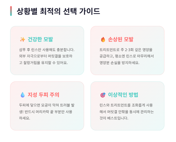 린스와 트리트먼트의 선택은 단순히 제품 한 가지를 고르는 게 아니라, 어떤 방식으로 내 머릿결을 더 잘 돌볼지에 관한 결정입니다. 린스는 매일의 외부 자극을 막아주는 보호막 같고, 트리트먼트는 지친 머릿결에 힘을 주는 영양제와도 같습니다.