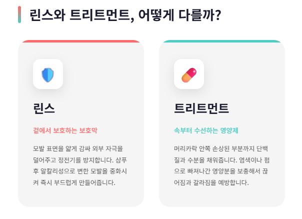 린스는 모발 표면을 얇게 감싸 외부 자극을 덜어주고, 정전기를 막아주는 잠깐의 보호막 역할을 합니다. 반면에 트리트먼트는 머리카락 안쪽, 손상된 부분까지 단백질과 수분을 채워주며 뿌리 깊은 건강을 도와주는 영양제에 가깝다고 볼 수 있어요.