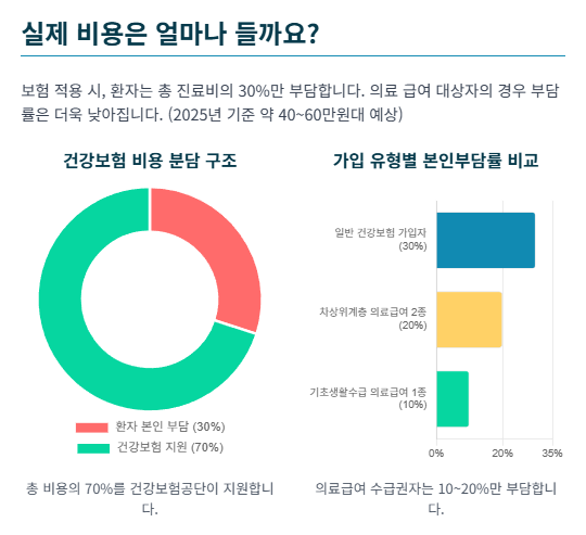 임플란트 시술에 건강보험이 적용되면, 전체 진료비는 국가에서 정한 기준에 따라 책정됩니다. 환자는 이 금액의 일부만 부담하게 되어, 비급여 치료에 비해 부담이 크게 줄어듭니다.