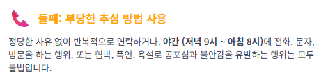 - 정당한 사유 없이 밤 9시부터 아침 8시 사이에 전화나 문자, 방문 등의 연락을 하는 경우 - 하루에 여러 차례 반복적으로 전화, 문자, 이메일, 방문 등으로 불안감을 조성하는 경우 - 협박이나 욕설, 폭력과 함께 대부업자나 사채를 이용해서 변제 자금을 마련하라며 강요하는 경우도 포함됩니다.