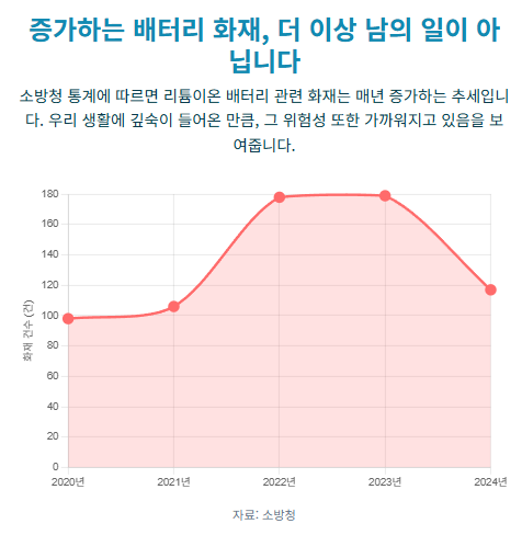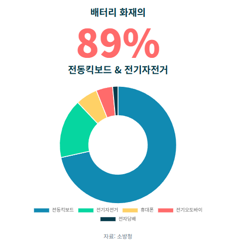 - 2020년부터 2024년까지 소방청의 발표에 따르면, 배터리 관련 화재는 해마다 꾸준히 늘고 있습니다. 특히 전체 배터리 화재의 약 89%가 전동킥보드와 전기자전거에서 일어났는데요, 이런 제품들은 충격이나 과충전에 약한 환경에서 자주 쓰이다 보니 사고가 더 많습니다.