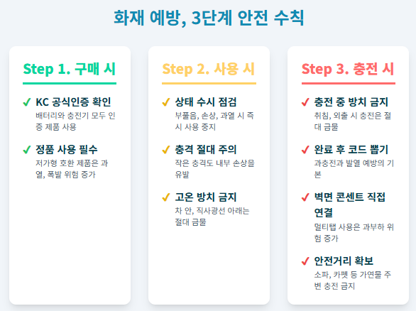 - 값싼 호환 제품이나 인증이 없는 충전기는 가급적 피해야 합니다. 이런 제품들은 정해진 전압이나 전류를 제대로 조절하지 못해, 심할 경우 과열이나 폭발 같은 큰 사고로 이어질 수 있습니다. 여러분의 작은 관심이 나와 가족의 안전을 지키는 첫걸음이 됩니다.