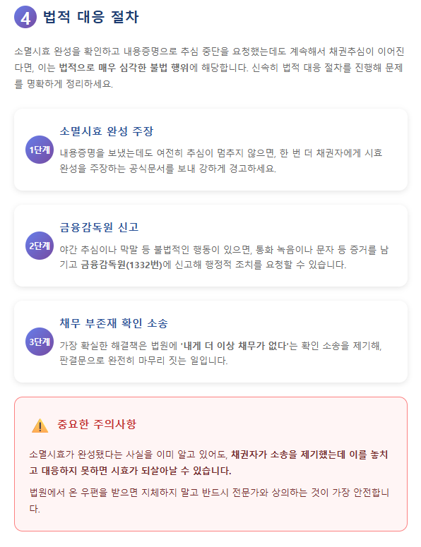 - 내용증명을 보냈는데도 여전히 추심이 멈추지 않으면, 한 번 더 채권자에게 시효 완성을 주장하는 공식문서를 보내 강하게 경고하세요.