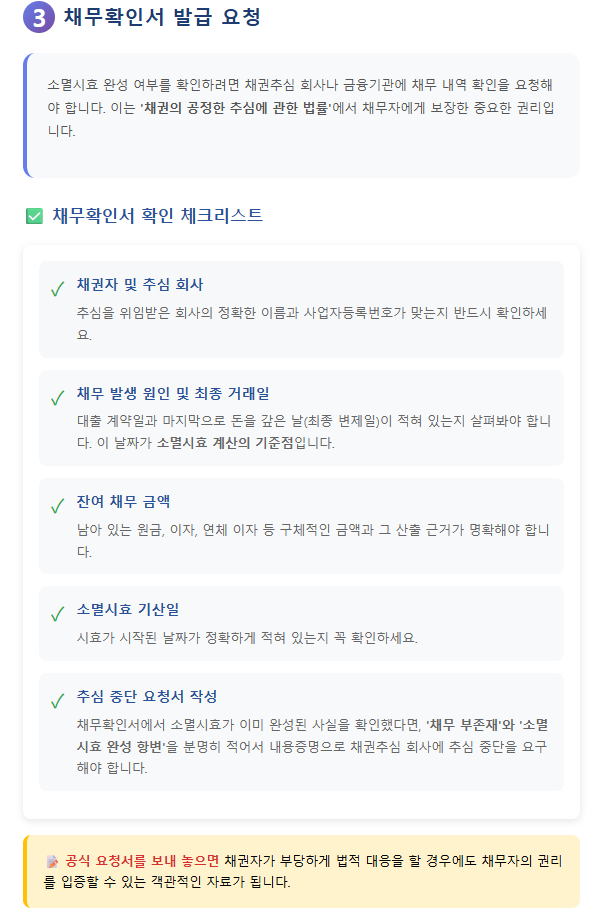 따라서 추심 연락이 오더라도, 섣불리 대응하기 전에 채무확인서 등을 통해 소멸시효가 정말로 완성됐는지 객관적으로 확인하는 것이 무엇보다 중요합니다.