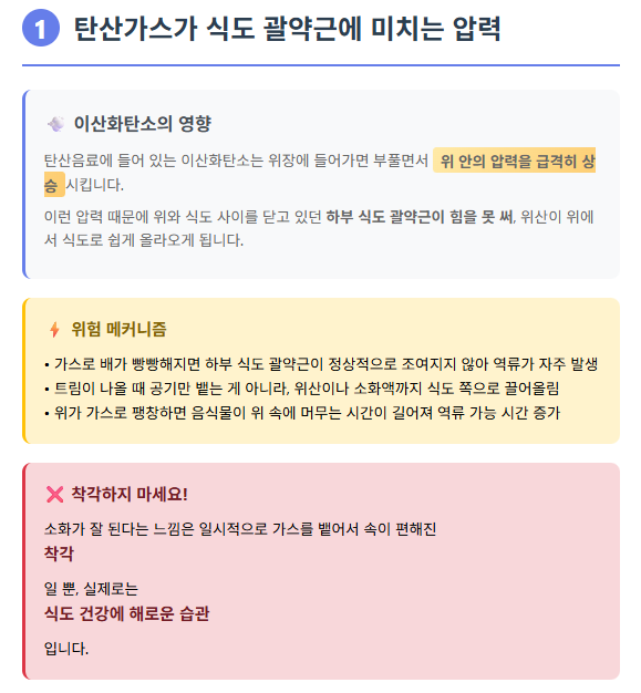 탄산음료에 들어 있는 이산화탄소는 위장에 들어가면 부풀면서 위 안의 압력을 급격히 올립니다. 이런 압력 때문에 위와 식도 사이를 닫고 있던 하부 식도 괄약근이 힘을 못 써, 위산이 위에서 식도로 쉽게 올라오게 됩니다.
