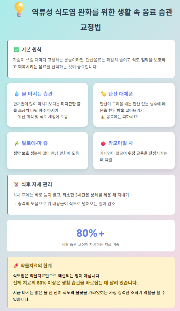 식도염은 약물치료만으로 해결되는 병이 아니며, 전체 치료의 80% 이상은 생활 습관을 바로잡는 데 달려 있다는 점을 기억해야 합니다. 지금 마시는 맑은 물 한 잔이 식도의 불꽃을 가라앉히는 가장 강력한 소화기 역할을 할 수 있어요.