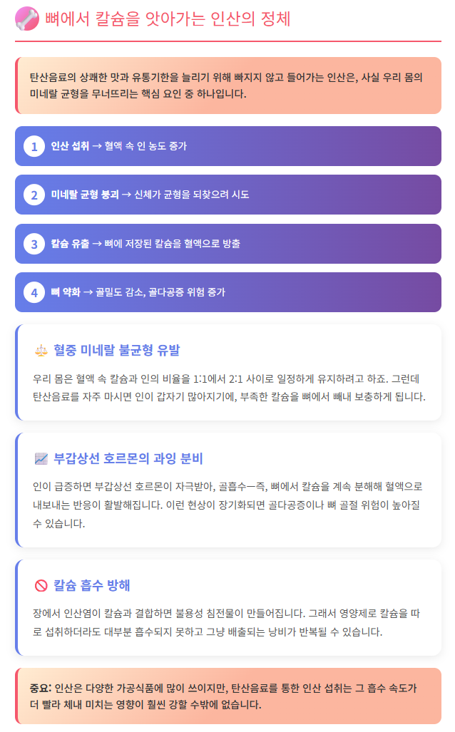 무더위나 스트레스에 시달릴 때, 톡 쏘는 탄산음료 한 잔이 주는 청량감은 참 거부하기 힘든 유혹입니다. 하지만 그 상쾌함 뒤에 숨은 ‘인산’이라는 성분이, 우리가 모르는 사이 뼈 건강을 조용히 위협하고 있을 수도 있습니다.단순히 갈증을 해소하는 수준을 넘어, 탄산음료가 우리 몸의 미네랄 균형을 어떻게 무너뜨리는지 그 과정을 제대로 이해하는 건 건강을 위해서 꼭 필요한 일입니다.