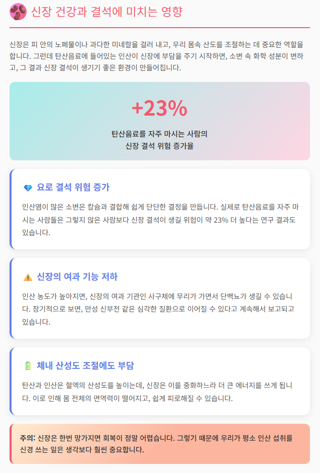 신장은 피 안의 노폐물이나 과다한 미네랄을 걸러 내고, 우리 몸속 산도를 조절하는 데 중요한 역할을 합니다. 그런데 탄산음료에 들어있는 인산이 신장에 부담을 주기 시작하면, 소변 속 화학 성분이 변하고, 그 결과 신장 결석이 생기기 좋은 환경이 만들어집니다.
