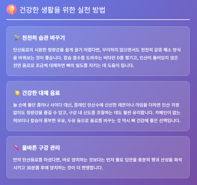탄산음료의 시원한 청량감을 쉽게 끊기 어렵다면, 무리하지 않으면서도 천천히 갈증 해소 방식을 바꿔보는 것이 좋습니다. 칼슘 흡수를 도와주는 비타민 D를 챙기고, 인산이 들어있지 않은 천연 음료로 조금씩 대체하면 뼈의 밀도를 지키는 데 도움이 됩니다.