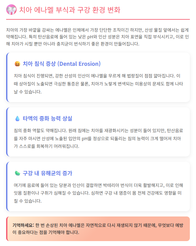 치아의 가장 바깥을 감싸는 에나멜은 인체에서 가장 단단한 조직이긴 하지만, 산성 물질 앞에서는 쉽게 약해집니다. 특히 탄산음료에 들어 있는 낮은 pH와 인산 성분은 치아 표면을 직접 부식시키고, 이로 인해 치아가 시릴 뿐만 아니라 충치균이 번식하기 좋은 환경이 만들어집니다.