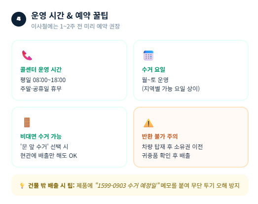 이런 사전 준비가 제대로 되지 않으면 수거가 지연되어 이사 등 중요한 일정에 차질이 생길 수 있으니, 꼼꼼히 확인해 주세요.